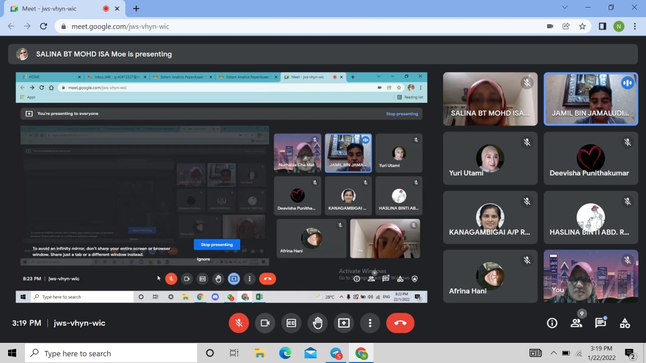 Saya mengagihkan guru guru kaunseling dalam 3 kumpulan Saya mengambil murid kelas 5 Alpha, 5 Beta dan 5 Farabi. Rozi mengambil murid kelas 5 Khawa, 5 Razi dan 5 Biruni. Azlina masuk google meet ke kelas 5 Khindi, 5 Ibnu Sina dan 5 Ibnu Rusyd.