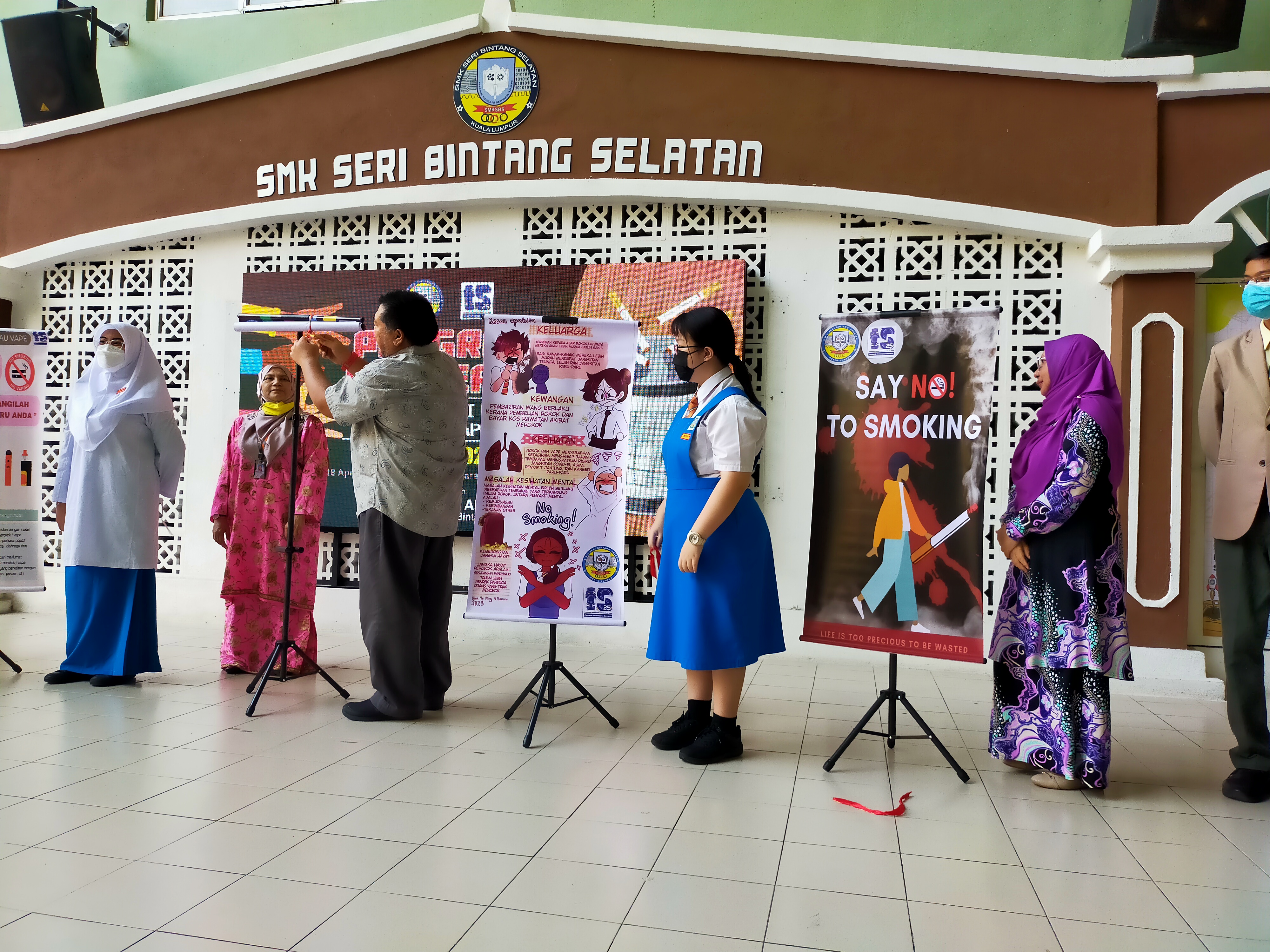 YDP PIBG dan pentadbir menggunting reben pada 5 banner . Banner ini hasil daripada pertandingan poster pencegahan vape dan rokok.